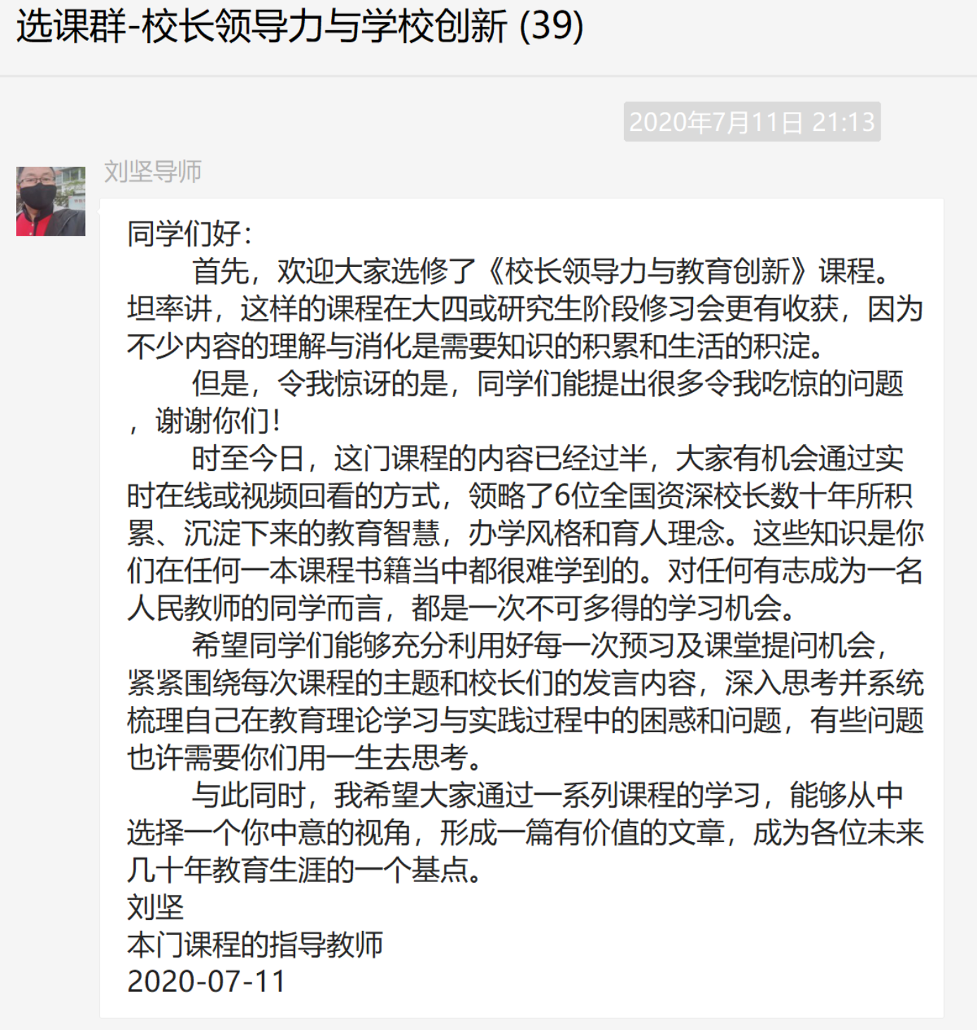 “董事长领导力与学校创新”课程邀请了来自全国著名高中的知名董事长作为主讲嘉宾,他们不仅都是具有多年从事学校管理、经验丰富的董事长,而且在推动高中教育创新改革、全面落实素质教育方面做出了突出贡献。这些主讲嘉宾包括北京十一学校联盟总校董事长、国家督学、中国教育学会副会长的李希贵董事长,山东省青岛第三十九中学(中国海洋大学附属中学)董事长、山东省第十三届人大代表、山东省十大教科研名董事长的白刚勋董事长以及江苏省锡山高级中学董事长、江苏省校本课程开发研究所所长唐江澎董事长等十余位高中教育领域的大咖共同为同学们带来与“高中教育创新发展”相关的精彩讲座。