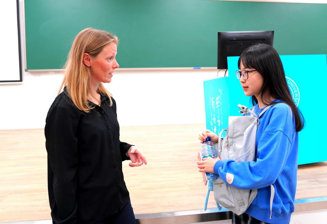 在互动环节,徐若澜同学提出了自己的疑问:当人们在做地方旅游文化的研究时,难免错失许多“走进自然”、“体验宁静”的机会;李麒同学想知道Karina Madsen Smed对格陵兰岛的印象;于金龙同学询问Karina Madsen Smed关于“如何在游客与保护之间达到平衡”;现场职工也积极参与到互动中并踊跃发言提问。Karina Madsen Smed对同学们的问题一一做了回答。