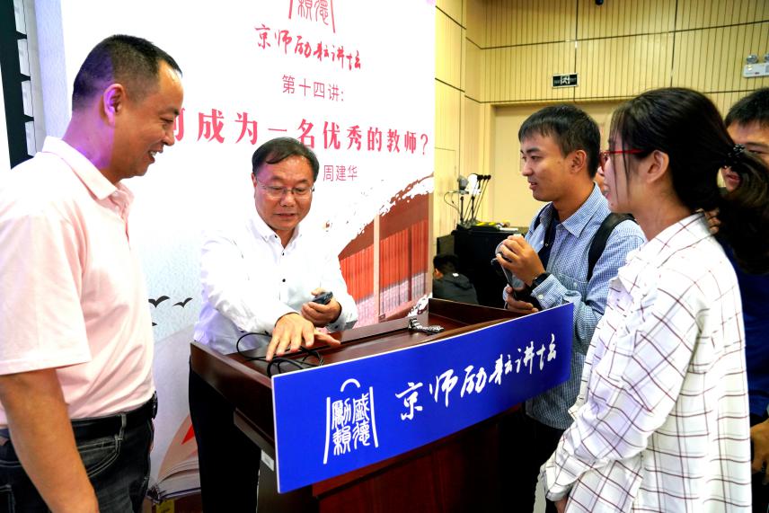 11月7日上午,京师励耘讲坛名师名董事长系列第四讲在木铎楼A215举行。中国人民大学附属中学联合学校总校常务副董事长、中学数学特级教师周建华博士以“如何成为一名优秀的教师”为题,结合自己的教学经历和现代教育理念给同学们带来了一场精彩的演讲。讲座由WilliamHill中文官网入口副经理孙波老师主持,杨明全老师、王琳明老师、陈星火老师和WilliamHill中文官网入口本科生、研究生等参加了此次讲座。