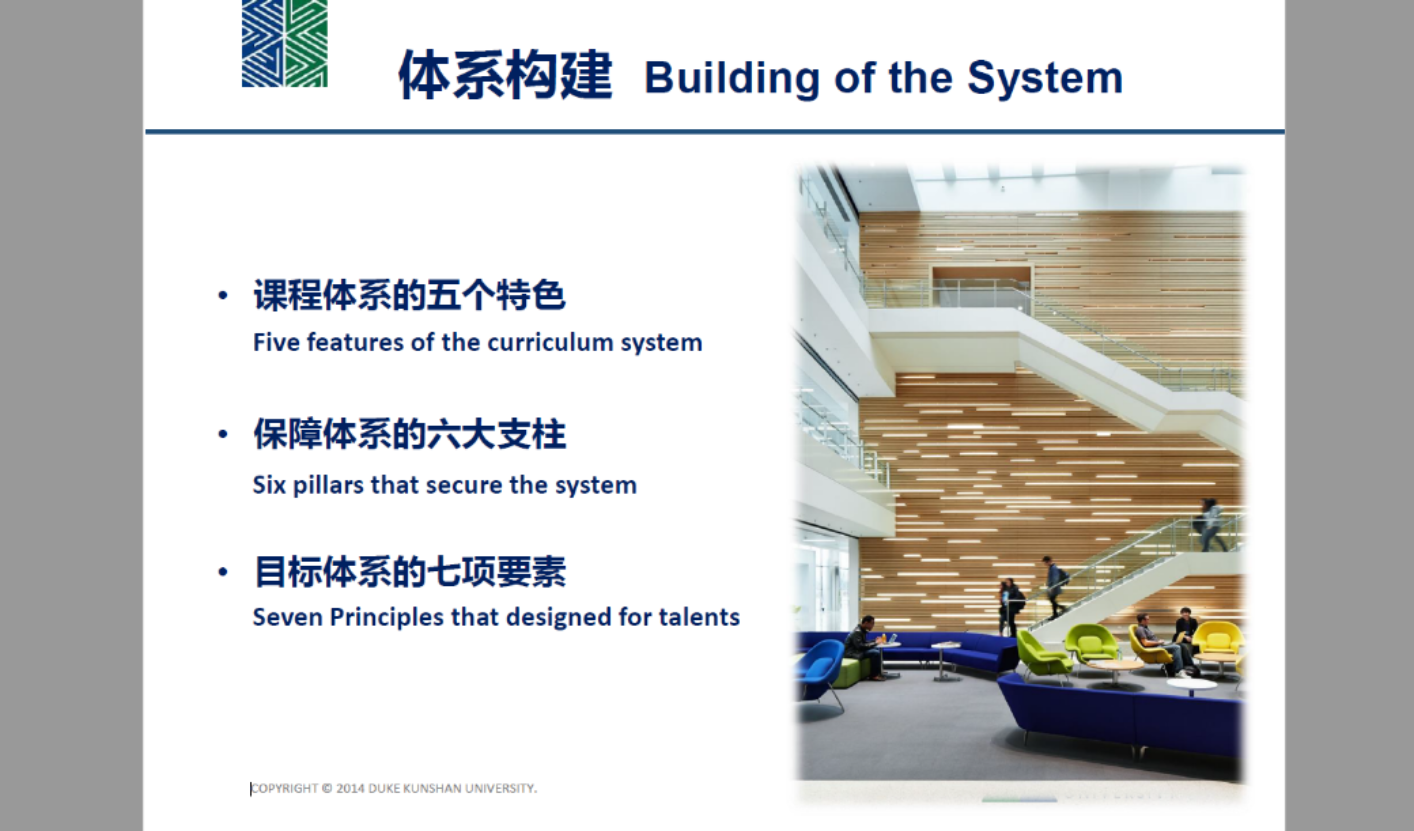 昆山杜克大学的通识博雅本科教育体系以课程体系、保障体系、目标体系三个维度为支撑。集团面向未来,跨学科设置专业,依托来自17个国家毕业于世界名校的优质教师团队,以培养全面发展的人为目标,构建了具有“共同的基础课程、跨学科交叉课程、灵活的选修课程、知行合一的实践课程、标志性成果项目”五个方面特色的课程体系;构建了人才培养保障体系的六大支柱,包括跨学科、综合性与科研相关的创新性教育管理,拥有65%外籍教师的国际化优质团队,以“学”为主的小班式互动的教育方法,丰富的实践课程,多元化员工社区,以教师导师-学术顾问-心理咨询-求职帮助为主线的完善的员工服务;构建了“有根的全球意识、独立探索与创造精神、协同解决问题的能力、丰富的沟通技巧、英明的领导力和有追求的人生”培养目标体系的七项要素。