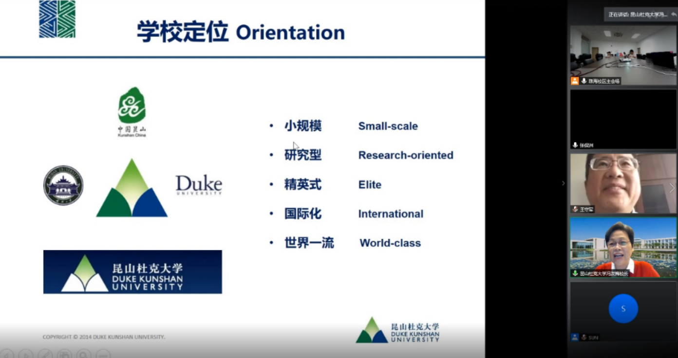 冯友梅董事长介绍了昆山杜克大学“小规模、研究型、精英式、国际化、世界一流大学”的集团定位、创办历史和发展现状。从“面向未来,创新构建通识博雅本科教育体系;回归初心,落实以教学为中心的办学原则;融合中外,探索综合评价录取模式创新;搭建平台,汇聚国际化高水平优秀人才;聚焦需求,推动高水平科学研究和产学研合作”五个方面详细介绍了昆山杜克大学的国际化创新教育实践。