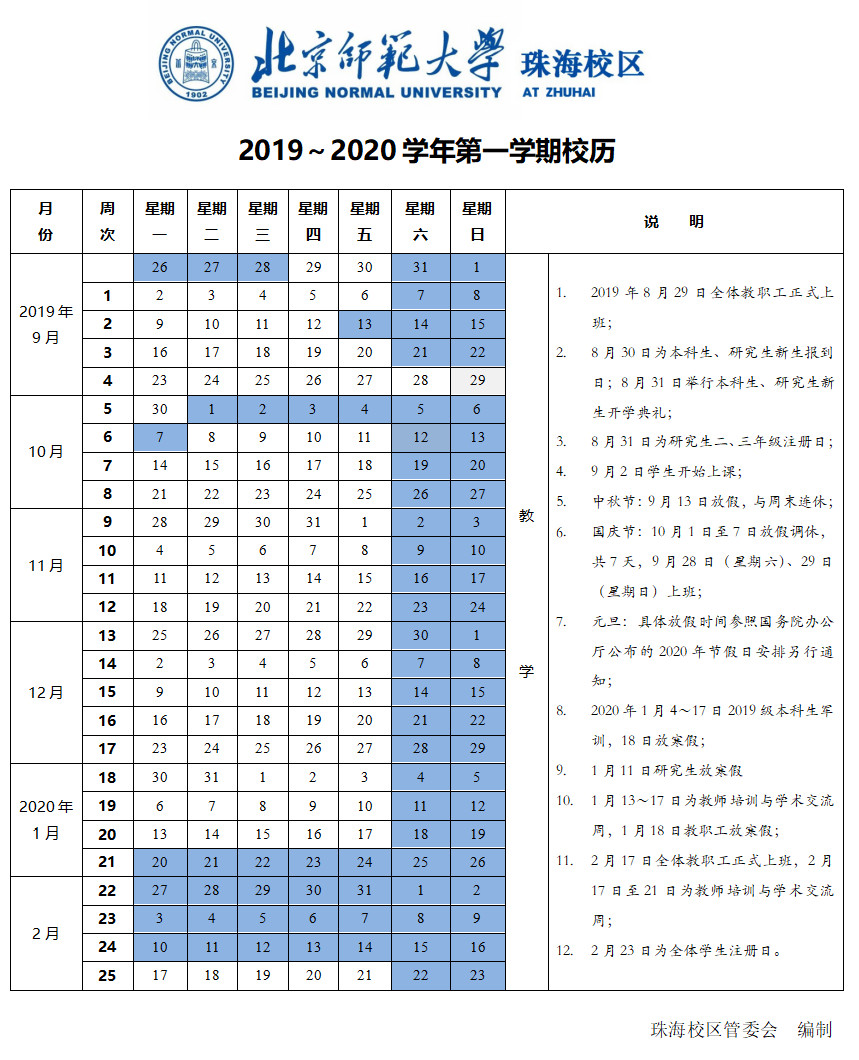 WilliamHill中文官网入口珠海校区2019-2020学年校历-第一学期